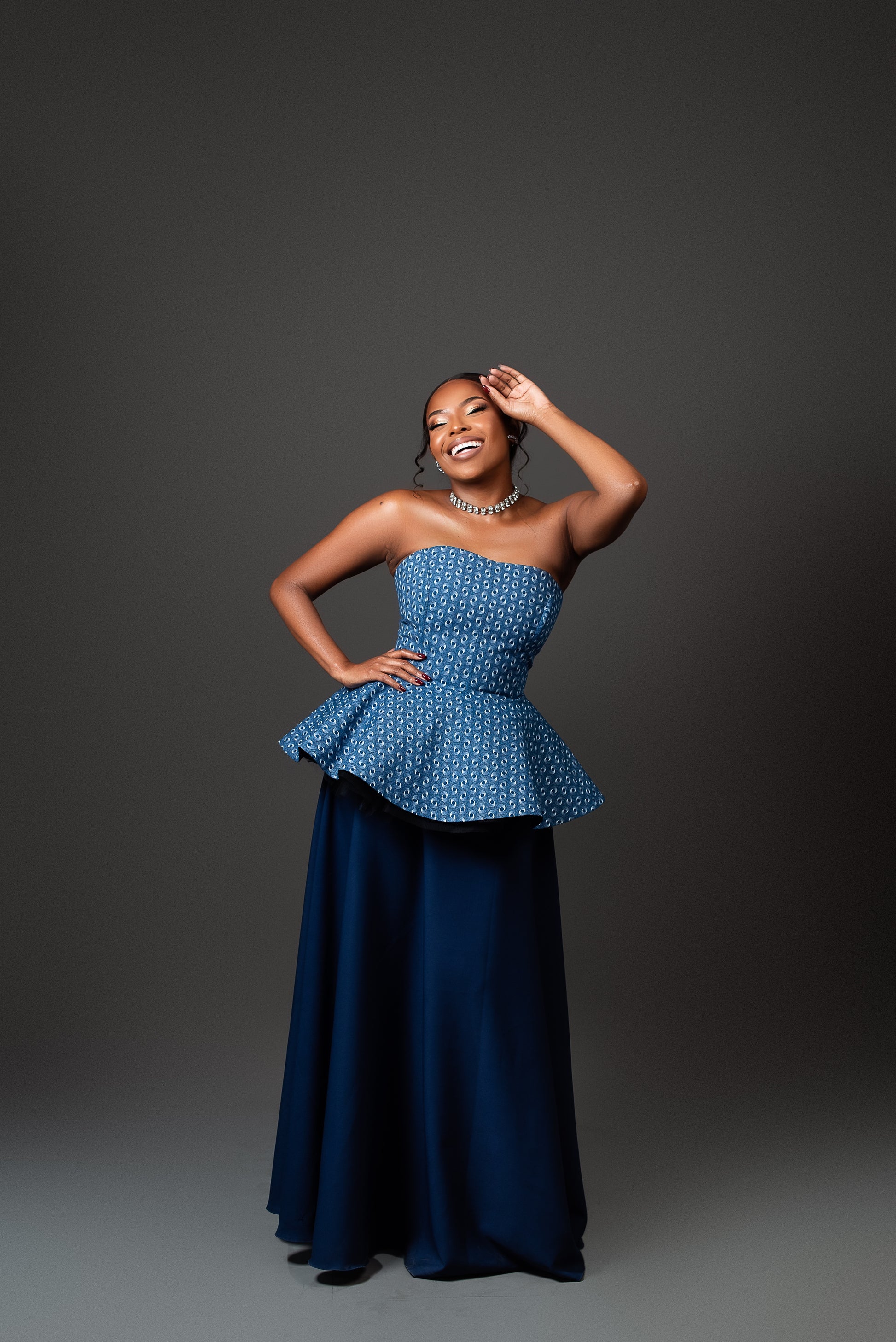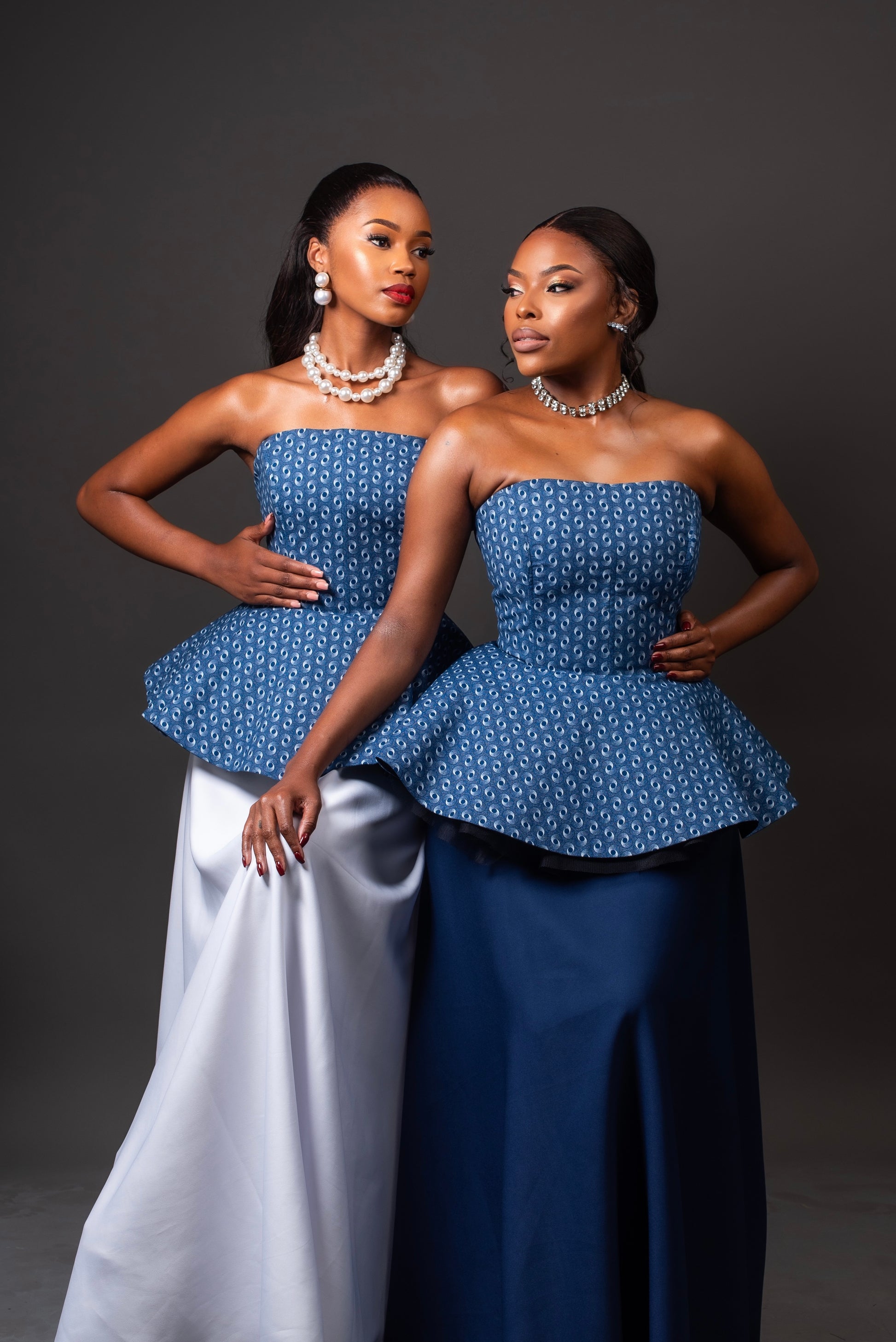 The strapless design boasts a structured peplum waist that flatters every figure, flowing into a floor-length skirt. With colour options of a Blue or White bottom, the Kgosigadi blends cultural heritage with modern sophistication.
