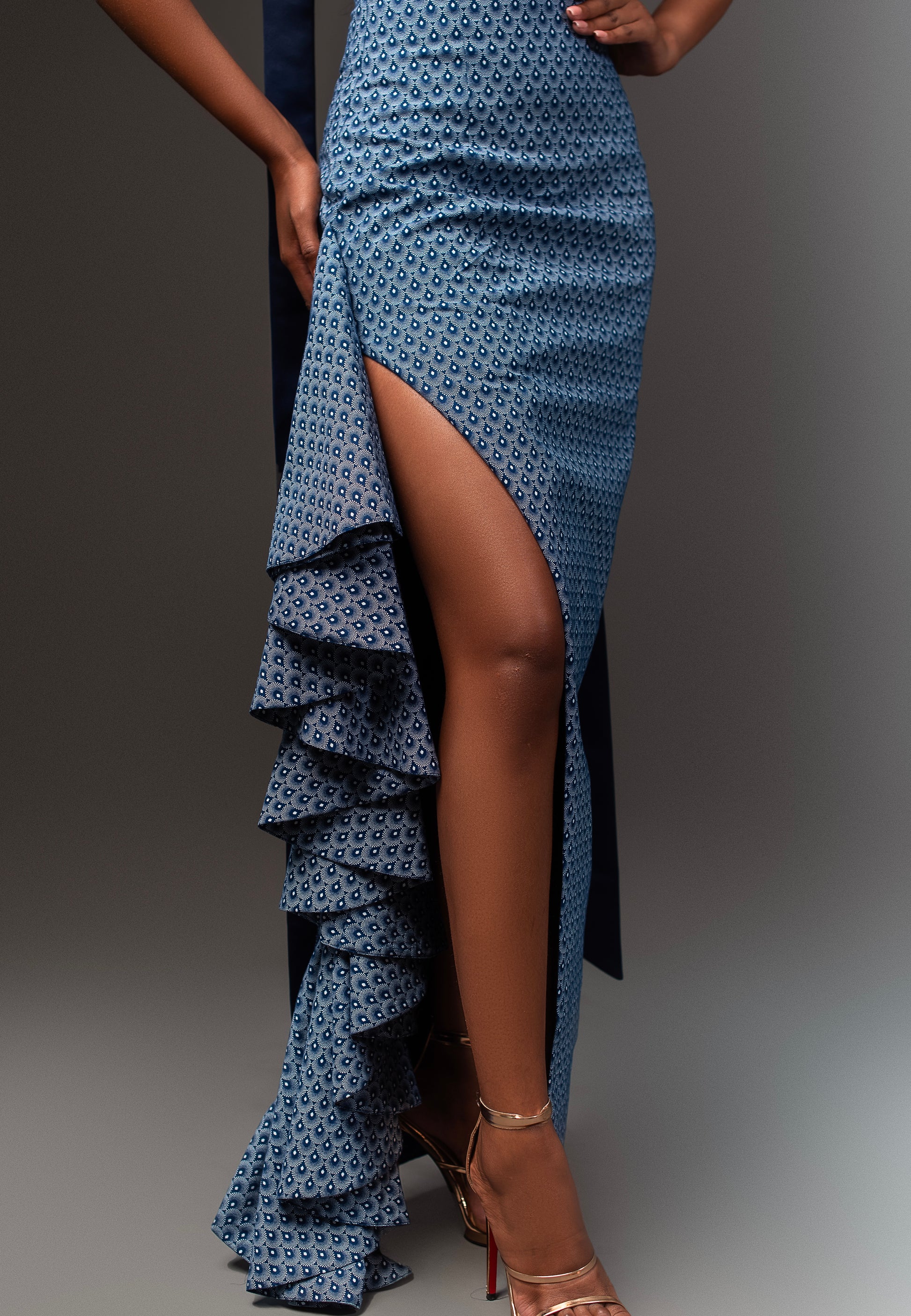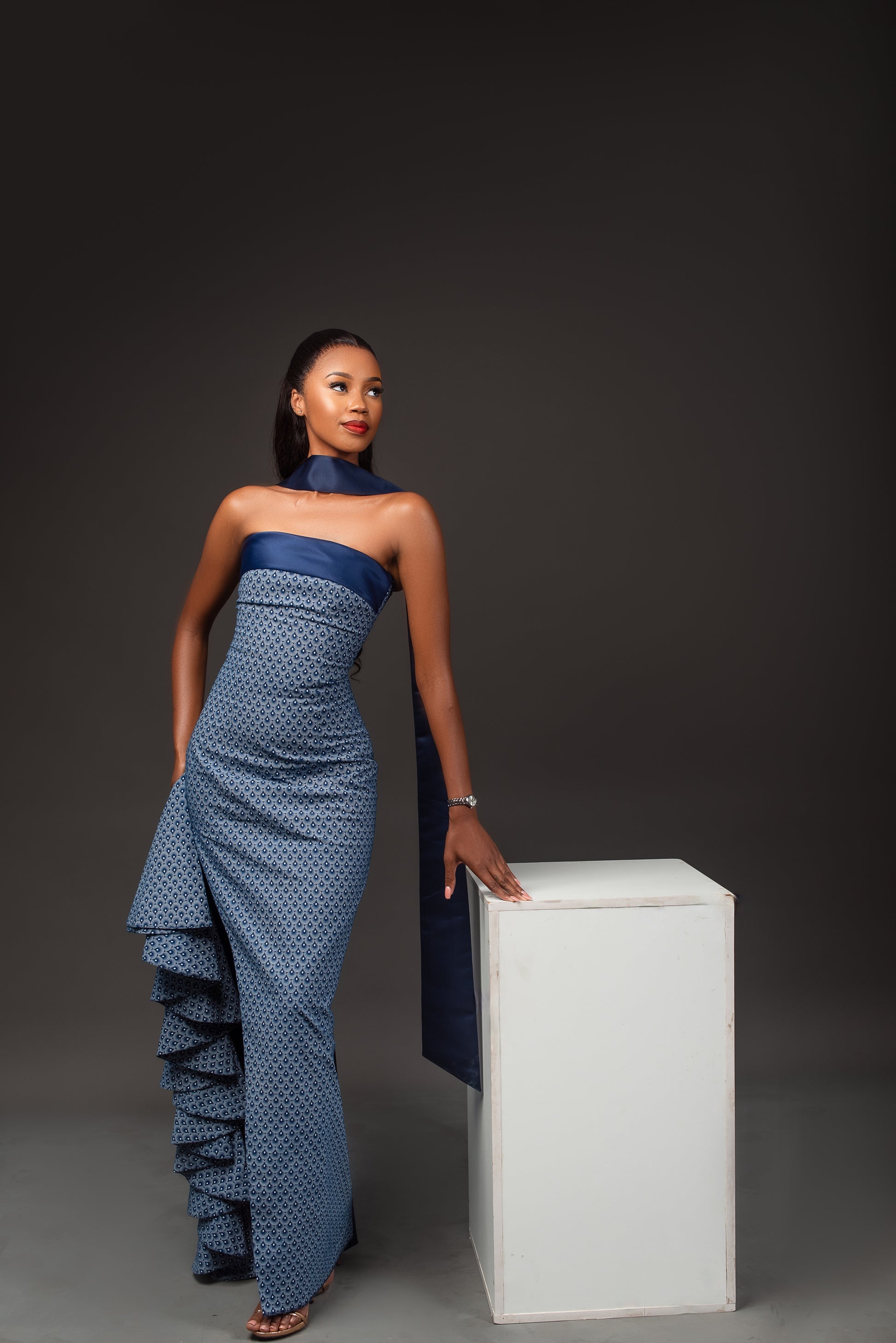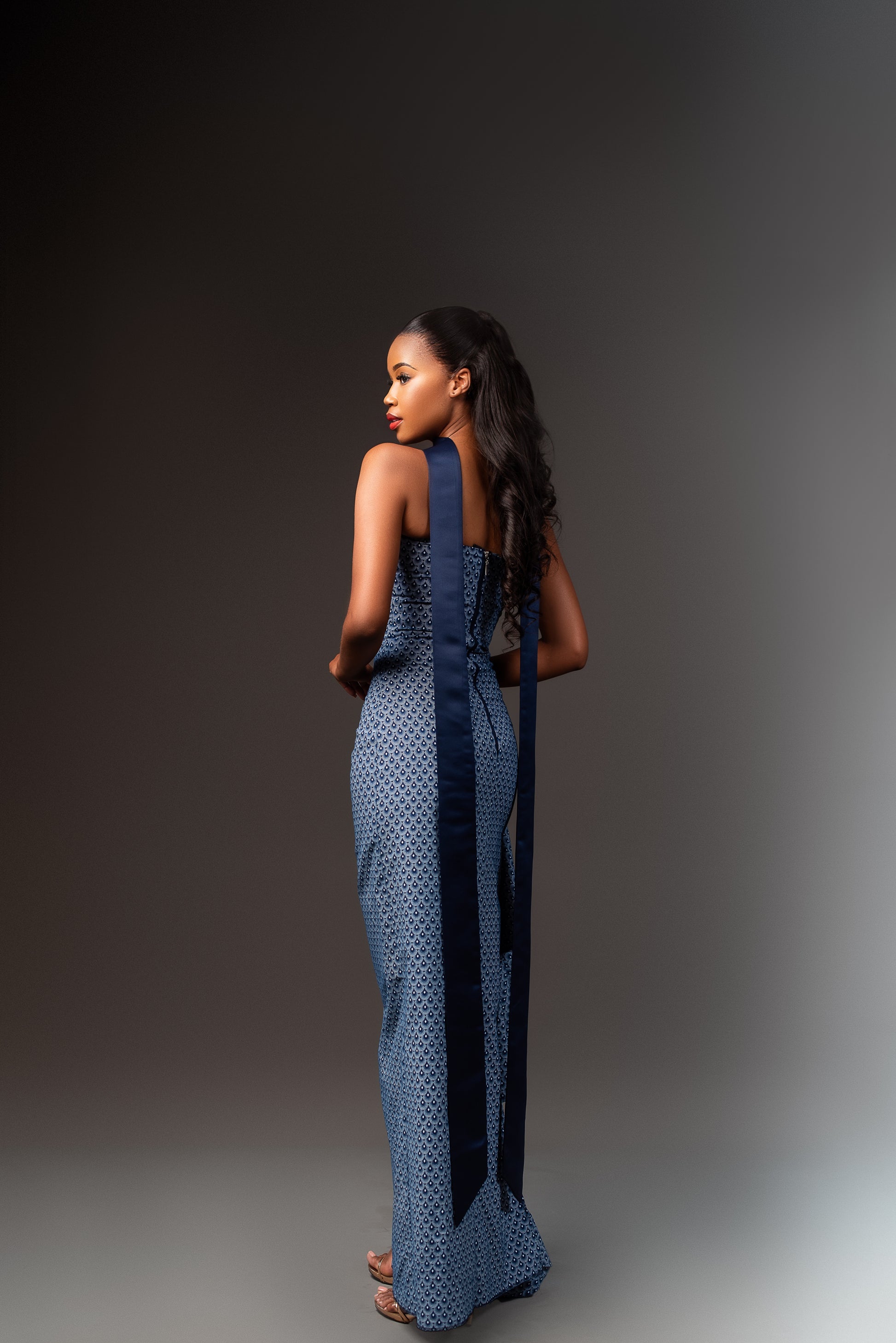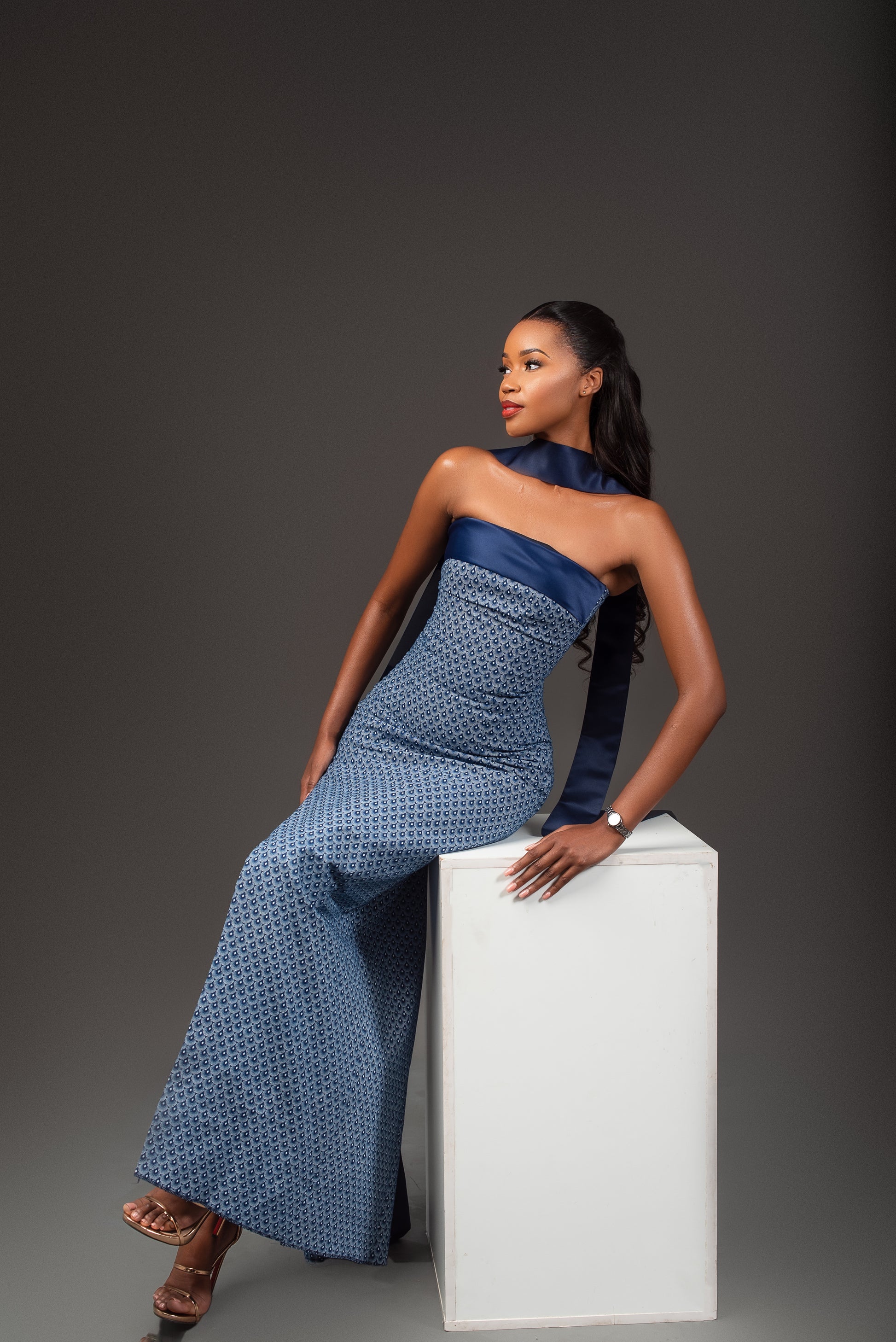 A modern take on tradition, this strapless gown is crafted from Botswana’s iconic leteisi fabric. It blends cultural elegance with contemporary glamour, a perfect pick for special occasions.